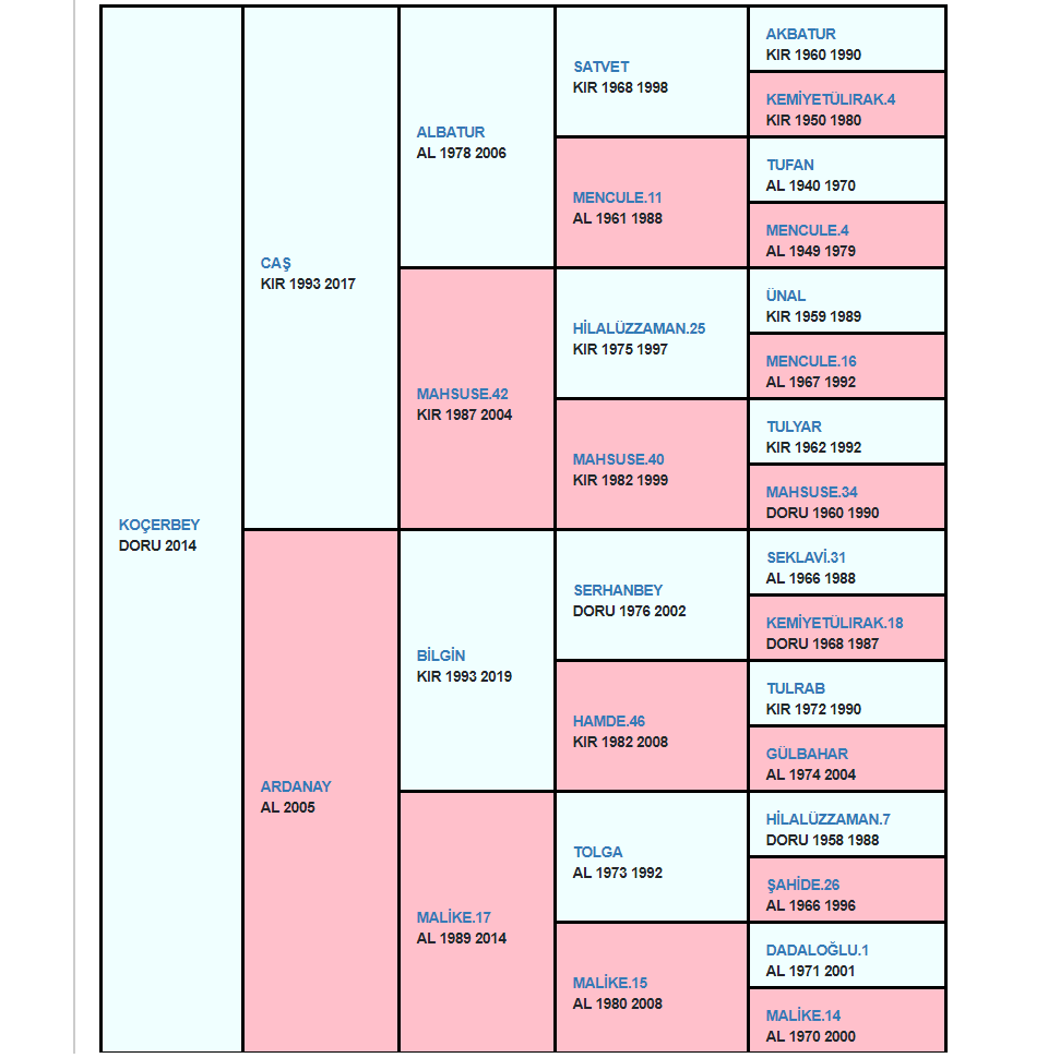 Aygırımız Koçerbey, Şampiyon Kaflaslı 'nın pedigrisine çok benzemektedir. Babadan Kafkaslı ile kardeş olup annesi Ardanay ise "1100 metre Bursa çim pist rekortmeni, "Darfur" ve "Göktekin" in öz kızkardeşi " dir.